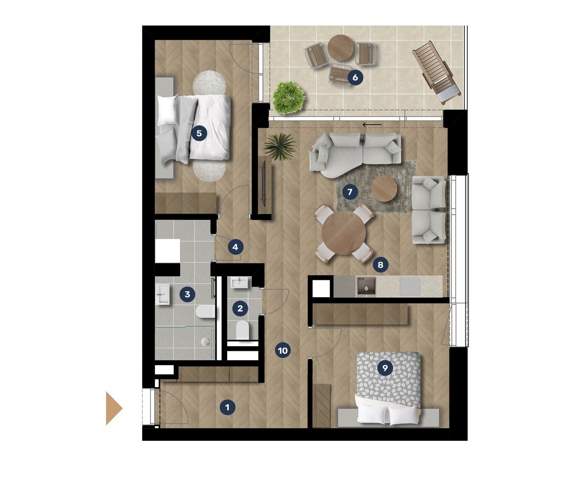 Az adatlapon megjelölt alaprajzi méretek vakolatlan falak közötti méretek, a kivitelezés során kismértékű méretváltozás lehetséges. Ezen dokumentációban közölt adatok a kiviteli tervek alapján kerültek megállapításra kizárólag tájékoztató jelleggel, nem minősülnek ajánlattételnek. Az alaprajzon feltüntetett bútorok tájékoztató jellegűek, azok rajzi elhelyezése nem feltétlenül tükrözi azok jövőbeni elhelyezhetőségét, illetve azok nem képzik a lakás részét.