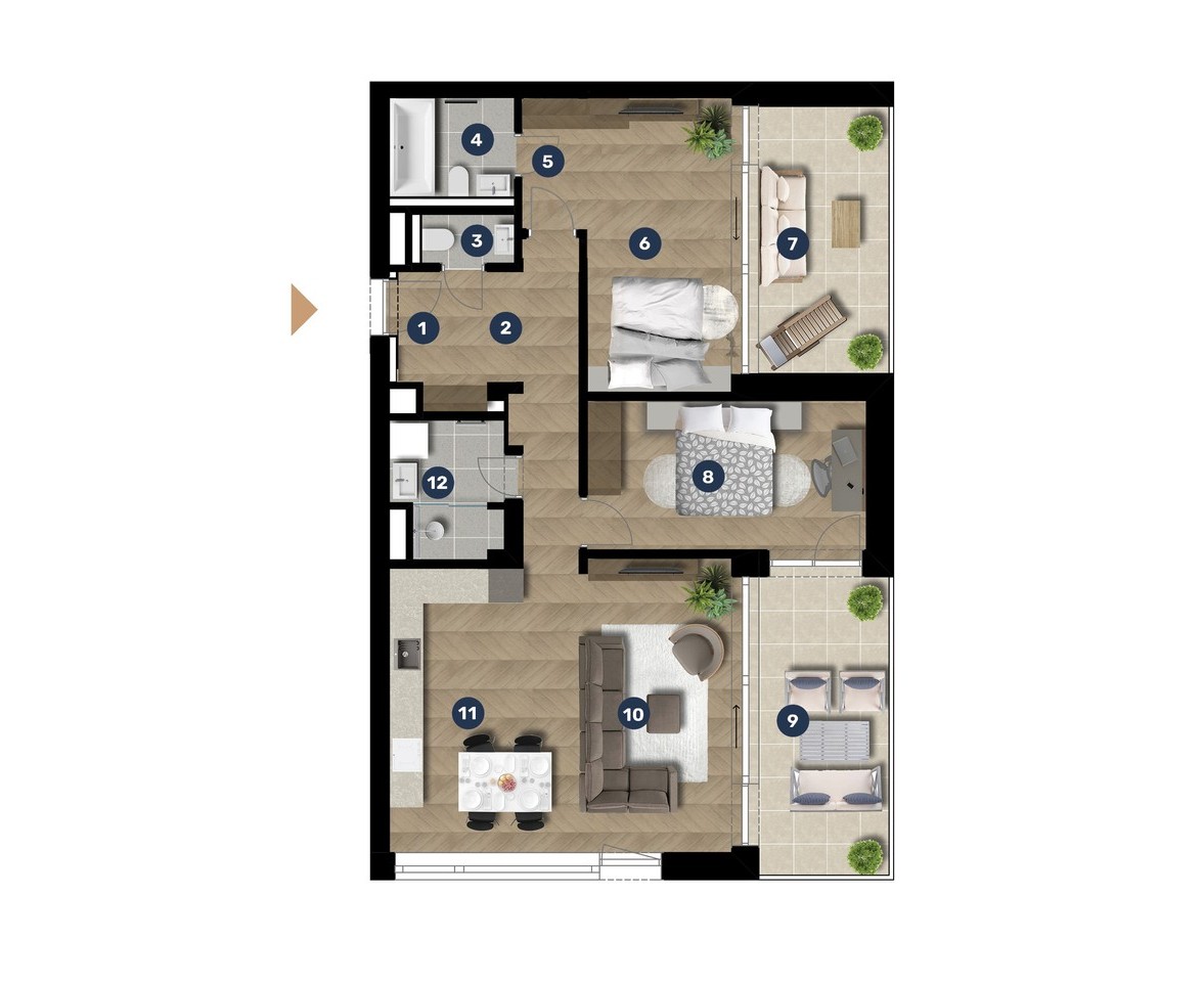Az adatlapon megjelölt alaprajzi méretek vakolatlan falak közötti méretek, a kivitelezés során kismértékű méretváltozás lehetséges. Ezen dokumentációban közölt adatok a kiviteli tervek alapján kerültek megállapításra kizárólag tájékoztató jelleggel, nem minősülnek ajánlattételnek. Az alaprajzon feltüntetett bútorok tájékoztató jellegűek, azok rajzi elhelyezése nem feltétlenül tükrözi azok jövőbeni elhelyezhetőségét, illetve azok nem képzik a lakás részét.