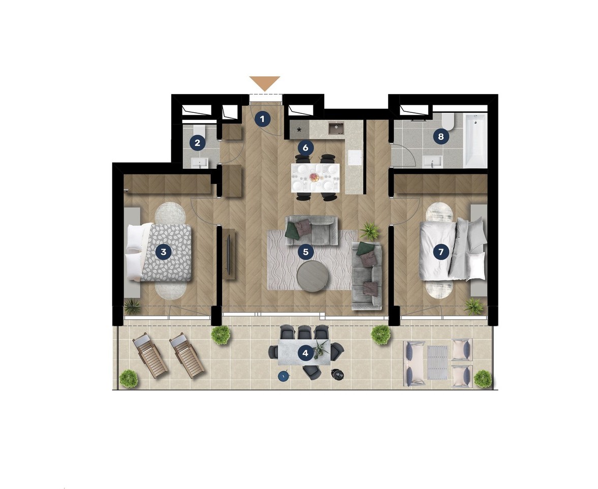 Az adatlapon megjelölt alaprajzi méretek vakolatlan falak közötti méretek, a kivitelezés során kismértékű méretváltozás lehetséges. Ezen dokumentációban közölt adatok a kiviteli tervek alapján kerültek megállapításra kizárólag tájékoztató jelleggel, nem minősülnek ajánlattételnek. Az alaprajzon feltüntetett bútorok tájékoztató jellegűek, azok rajzi elhelyezése nem feltétlenül tükrözi azok jövőbeni elhelyezhetőségét, illetve azok nem képzik a lakás részét.