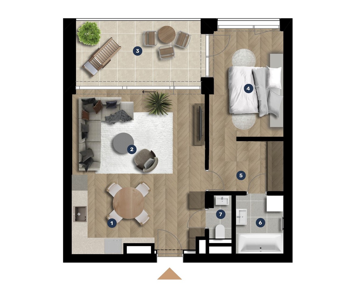 Az adatlapon megjelölt alaprajzi méretek vakolatlan falak közötti méretek, a kivitelezés során kismértékű méretváltozás lehetséges. Ezen dokumentációban közölt adatok a kiviteli tervek alapján kerültek megállapításra kizárólag tájékoztató jelleggel, nem minősülnek ajánlattételnek. Az alaprajzon feltüntetett bútorok tájékoztató jellegűek, azok rajzi elhelyezése nem feltétlenül tükrözi azok jövőbeni elhelyezhetőségét, illetve azok nem képzik a lakás részét.