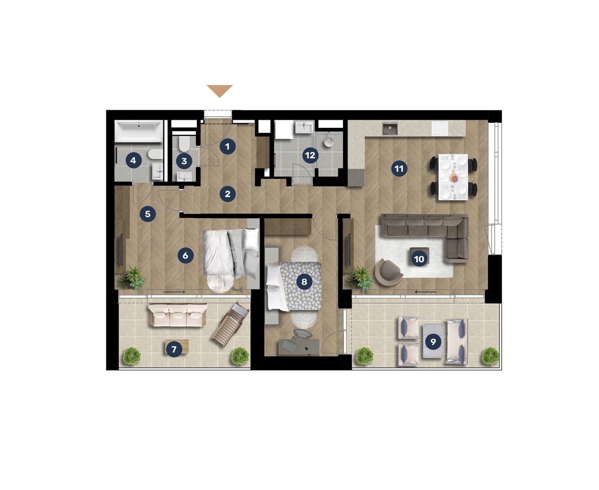 Az adatlapon megjelölt alaprajzi méretek vakolatlan falak közötti méretek, a kivitelezés során kismértékű méretváltozás lehetséges. Ezen dokumentációban közölt adatok a kiviteli tervek alapján kerültek megállapításra kizárólag tájékoztató jelleggel, nem minősülnek ajánlattételnek. Az alaprajzon feltüntetett bútorok tájékoztató jellegűek, azok rajzi elhelyezése nem feltétlenül tükrözi azok jövőbeni elhelyezhetőségét, illetve azok nem képzik a lakás részét.