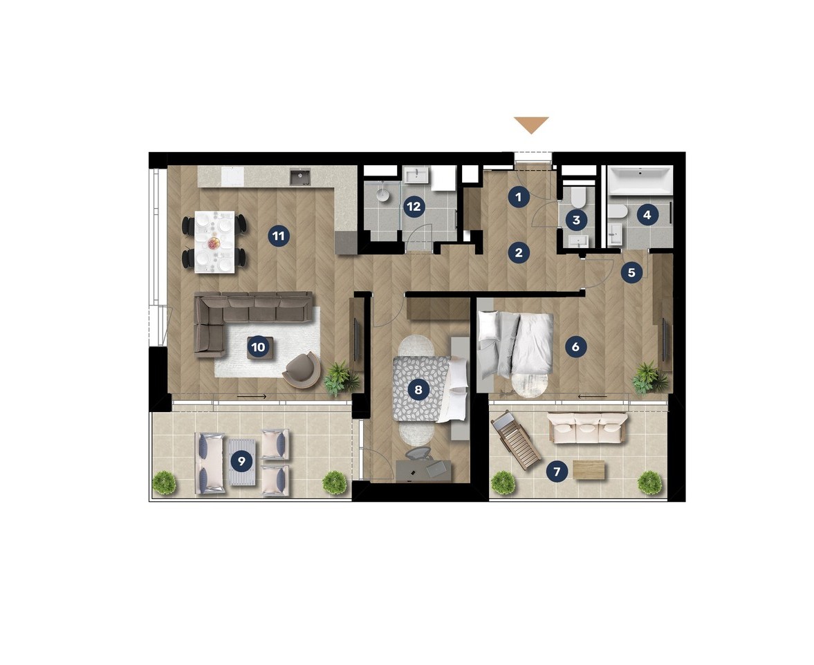 Az adatlapon megjelölt alaprajzi méretek vakolatlan falak közötti méretek, a kivitelezés során kismértékű méretváltozás lehetséges. Ezen dokumentációban közölt adatok a kiviteli tervek alapján kerültek megállapításra kizárólag tájékoztató jelleggel, nem minősülnek ajánlattételnek. Az alaprajzon feltüntetett bútorok tájékoztató jellegűek, azok rajzi elhelyezése nem feltétlenül tükrözi azok jövőbeni elhelyezhetőségét, illetve azok nem képzik a lakás részét.