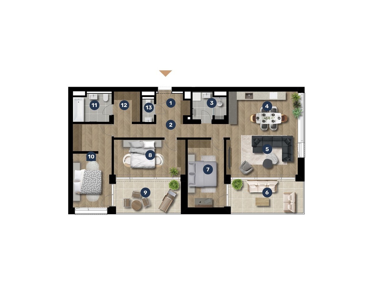 Az adatlapon megjelölt alaprajzi méretek vakolatlan falak közötti méretek, a kivitelezés során kismértékű méretváltozás lehetséges. Ezen dokumentációban közölt adatok a kiviteli tervek alapján kerültek megállapításra kizárólag tájékoztató jelleggel, nem minősülnek ajánlattételnek. Az alaprajzon feltüntetett bútorok tájékoztató jellegűek, azok rajzi elhelyezése nem feltétlenül tükrözi azok jövőbeni elhelyezhetőségét, illetve azok nem képzik a lakás részét.