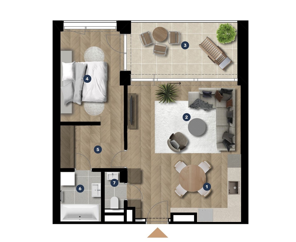 Az adatlapon megjelölt alaprajzi méretek vakolatlan falak közötti méretek, a kivitelezés során kismértékű méretváltozás lehetséges. Ezen dokumentációban közölt adatok a kiviteli tervek alapján kerültek megállapításra kizárólag tájékoztató jelleggel, nem minősülnek ajánlattételnek. Az alaprajzon feltüntetett bútorok tájékoztató jellegűek, azok rajzi elhelyezése nem feltétlenül tükrözi azok jövőbeni elhelyezhetőségét, illetve azok nem képzik a lakás részét.