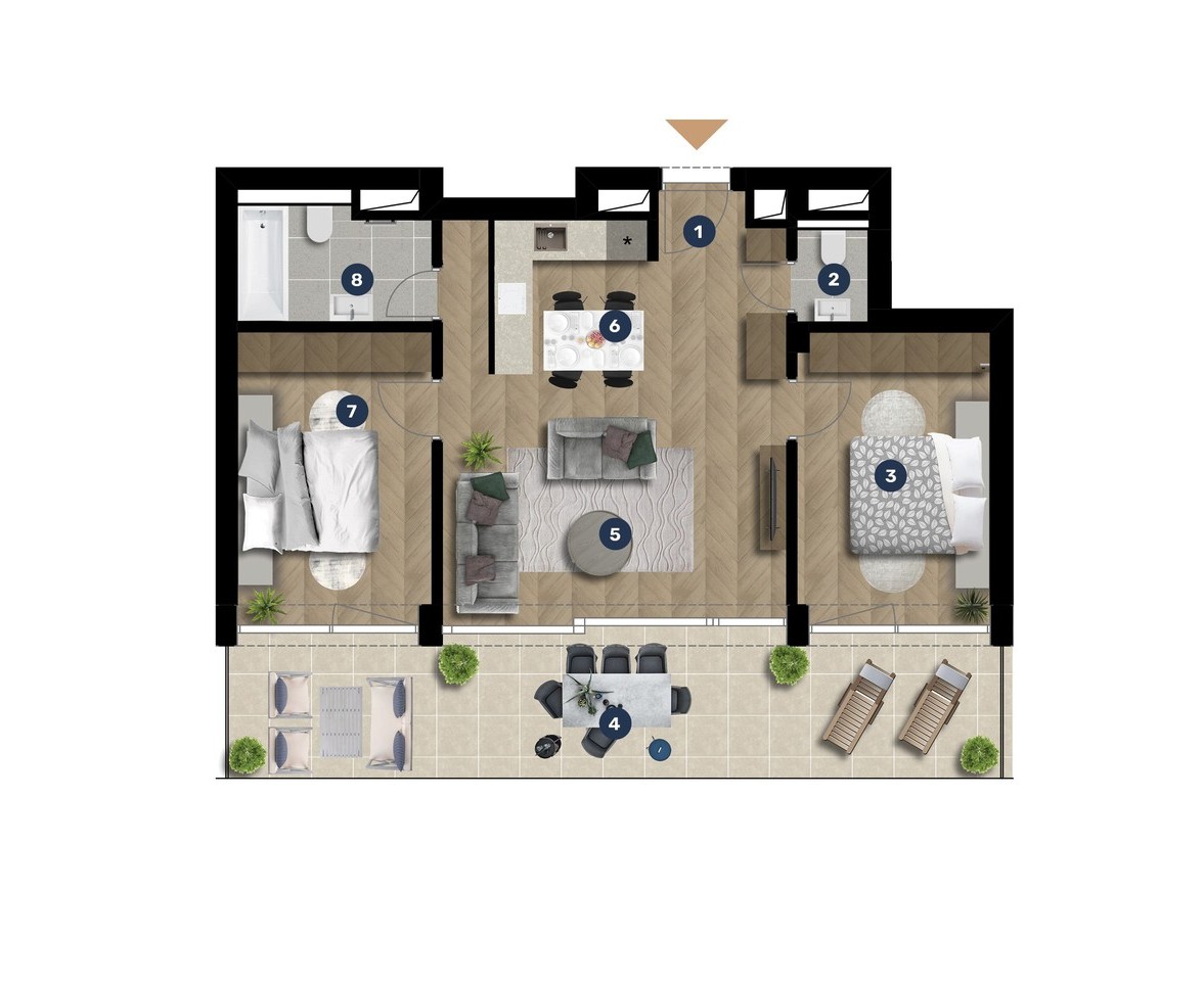 Az adatlapon megjelölt alaprajzi méretek vakolatlan falak közötti méretek, a kivitelezés során kismértékű méretváltozás lehetséges. Ezen dokumentációban közölt adatok a kiviteli tervek alapján kerültek megállapításra kizárólag tájékoztató jelleggel, nem minősülnek ajánlattételnek. Az alaprajzon feltüntetett bútorok tájékoztató jellegűek, azok rajzi elhelyezése nem feltétlenül tükrözi azok jövőbeni elhelyezhetőségét, illetve azok nem képzik a lakás részét.